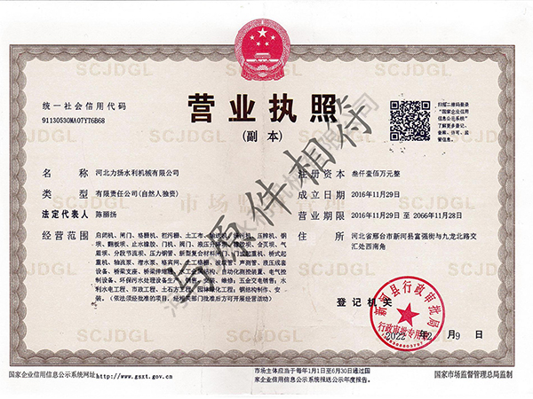 河北力揚水利機械有限公司,成立于2016年,地址河北省邢臺市新河縣富強街與九龍北路交匯處西南角具備生產及供應、安裝能力。我們公司位于董振堂將軍故里,河北省邢臺市新河縣九龍工業(yè)區(qū),是一家集設計、生產、銷售、安裝、售后一體的綜合性水利機械廠家,現(xiàn)有人員共40余名,獲有國家頒發(fā)的全國工業(yè)產品生產許可證、ISO質量管理體系認證、環(huán)境體系認證、職業(yè)健康體系認證并且我公司通過水利相關部門水工金屬結構質量檢驗中心的考核和監(jiān)督下獲得了:認證頒發(fā)的四項產品認證證書(平面閘門、弧形閘門、回轉式清污機、耙斗式清污